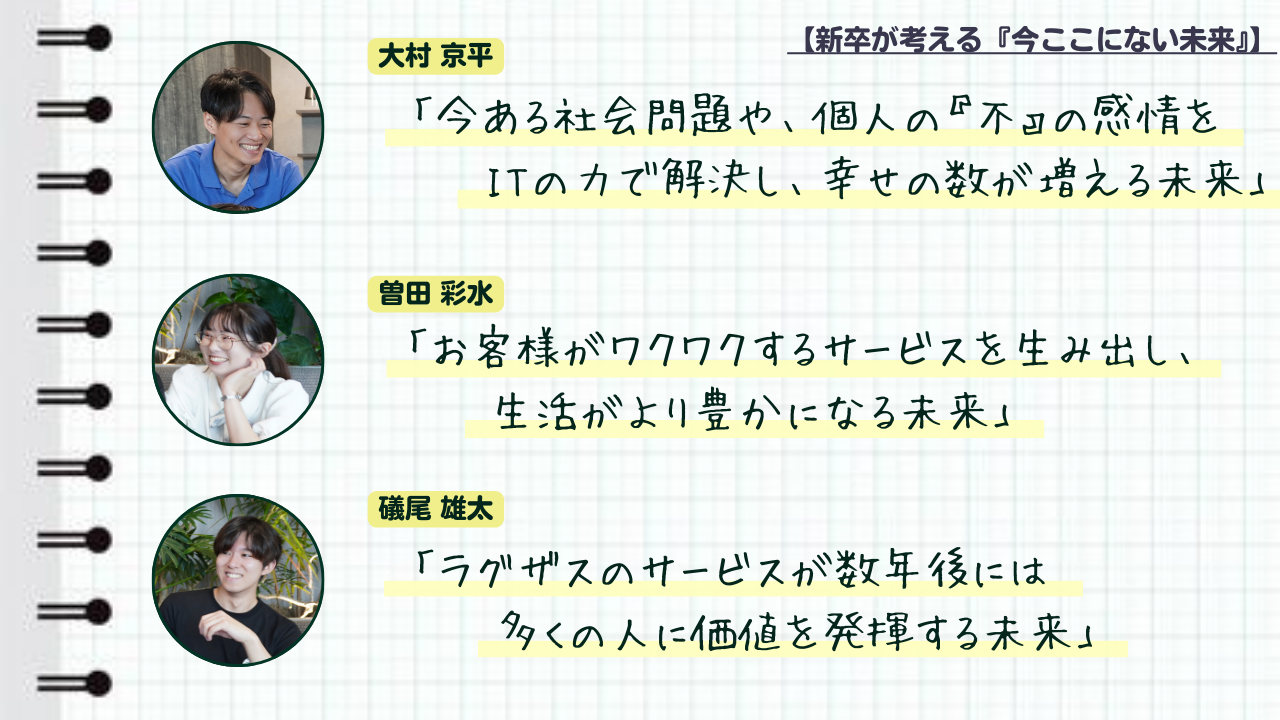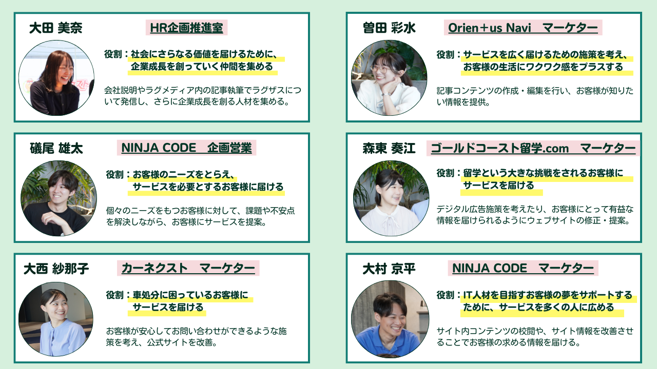 今回は、新卒インタビュー【PART②】として、「新卒生の現在」に焦点を当てて6人のそれぞれの取り組みと想いを教えてもらいました。次回の【PART③】は、新卒インタビュー最終パートの「新卒生の未来」についてです!一期生が今後ラグザスで成し遂げたいことを深ぼっていくので、【PART③】もお楽しみに!