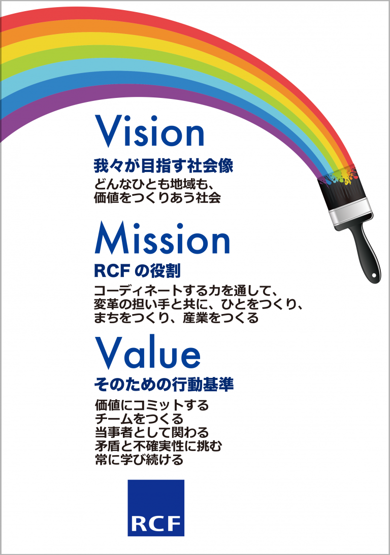 RCFには2013年に当時の社員全員で約3ヶ月間、何度も議論を重ねて作った「ビジョン・ミッション・バリュー」があり、RCFのアイデンティティとして、とても大切にしています。