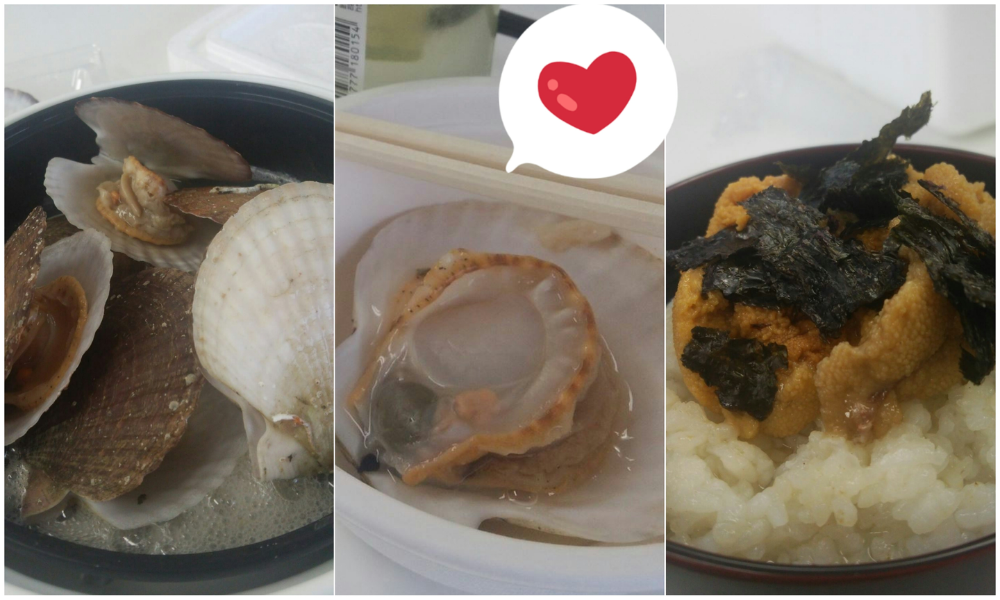写真左・中央:釜石市唐丹で現地スタッフが漁師さんからしこたま頂いた小粒の活ホタテ。東京のオフィスに送ってもらい、急きょ「酒蒸しパーティ」に。