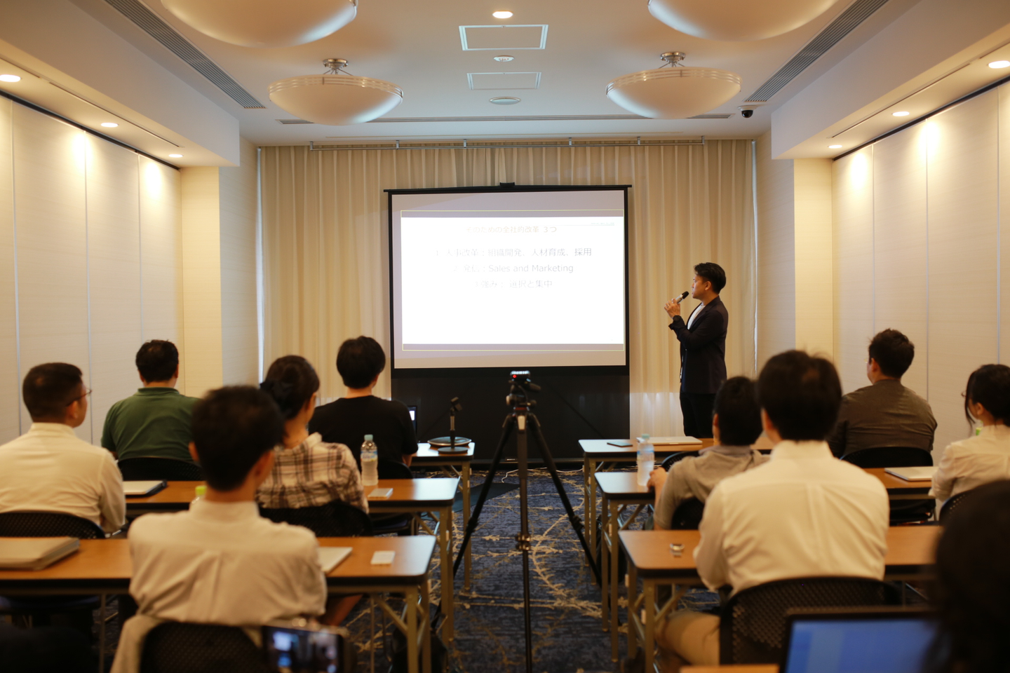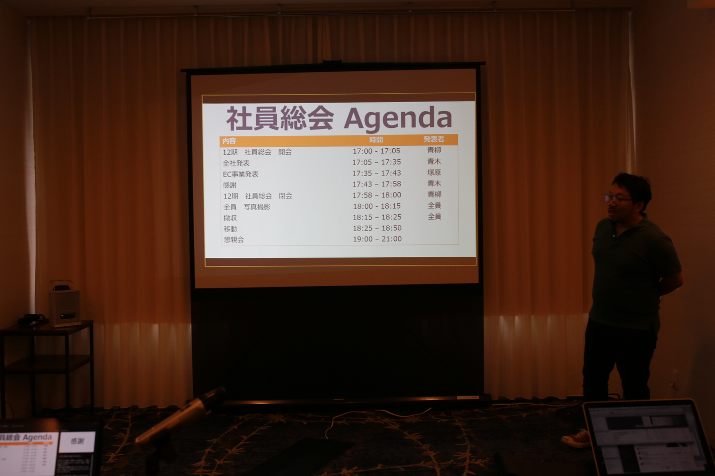 まずは代表の青木さんが昨年度の総評と今年度の方向性については発表。おかげさまで昨年度は予算目標を達成し、今年はさらにチャレンジングな目標を設定。皆さん神妙な面持ちで聞いていました。