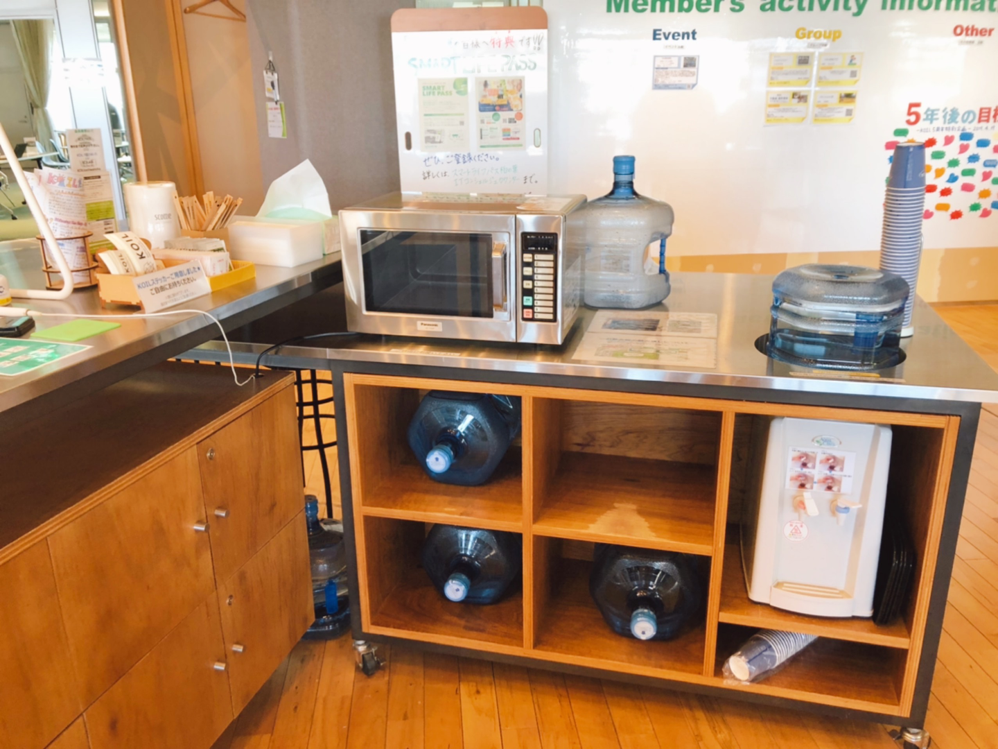 電子レンジ・ウォーターサーバー・冷蔵庫なども置いてあり、設備もめっちゃ充実!