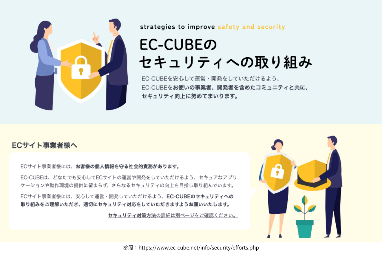2年前に経産省からEC-CUBEのセキュリティについての注意喚起がされたことがきっかけで、セキュリティ問題が大きく話題になってしまったとのこと。そこでイーシーキューブ社は2021年12月21日にセキュリティへの取り組みページを公開。現在もブラッシュアップをしながら対策を行っているそうです💡