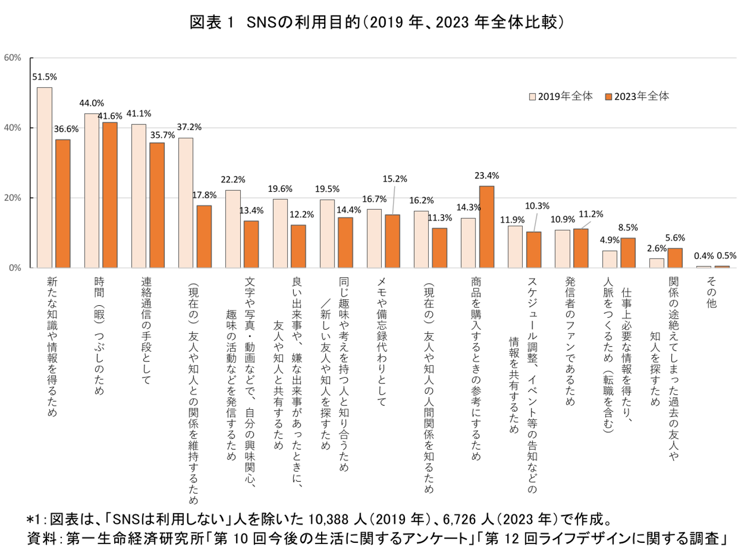 SNSの利用目的について2019年と2023年の回答を比較しました。