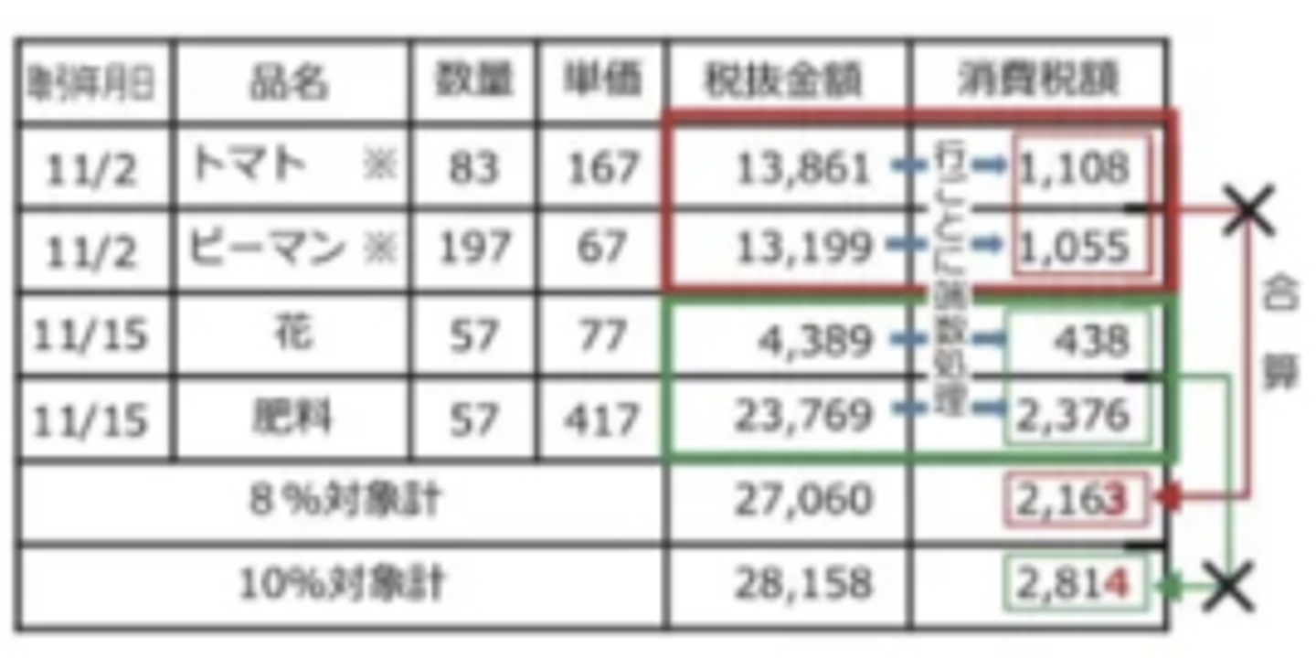 商品ごとに消費税額等を計算。端数処理を行い、その合計額を「税率ごとに区分した消費税額等」として記載することは認められません🙅🏻♂️