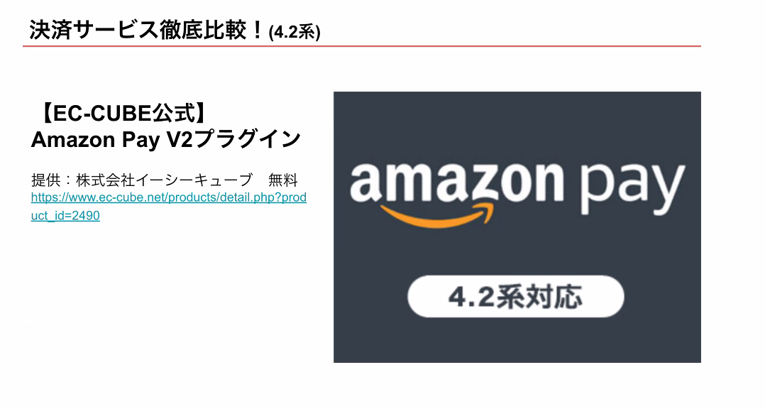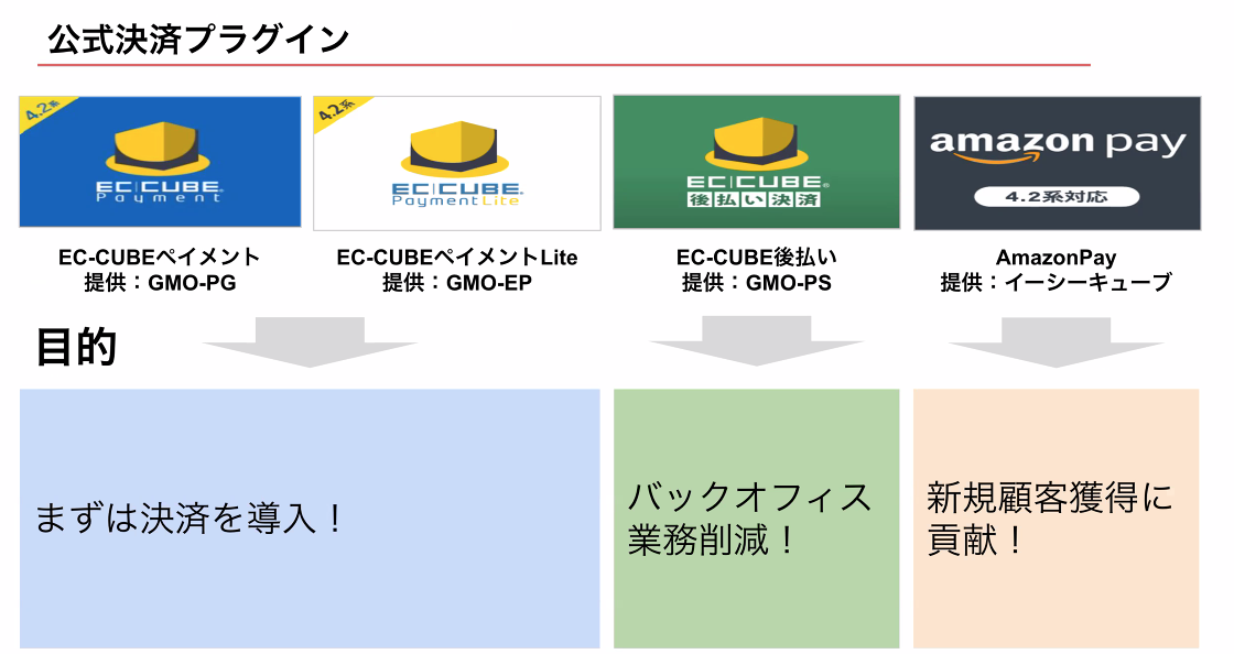 梅本)決済事業チームに所属し、その中でも公式決済プラグインを担当しています。公式決済プラグインの大枠は4つあります。EC-CUBEペイメント・EC-CUBEペイメントLite:複数決済を提供後払い:BOの業務削減に効果があるAmazon:新規顧客の獲得に貢献