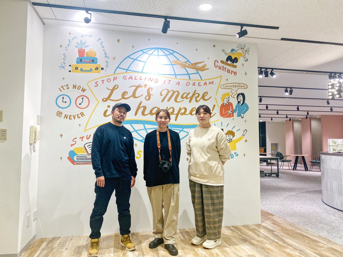 オフィスに入り目の前に見えるカラフルなイラストは、”手描きグラフィックアーティスト”として第一線を進み続けるCHALKBOY(チョークボーイ)さんによる手描きアート。色鮮やかなイラストとインパクトのあるメッセージで、これから留学に挑戦する方々を応援しています。