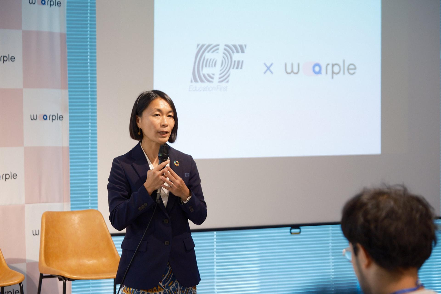 事業説明の後には、『warple』との提携校を代表して語学学校『EF Education First(イーエフ エデュケーション ファースト、以下EF)』のMarketing Directorである伊丹 麻衣子 様が登壇され、留学経験やwarple提携の経緯についてご説明いただきました。『EF』は、スウェーデンを発祥に、世界50都市に展開をしている語学学校で、世界100都市から生徒が集まる人気校として認知されています。