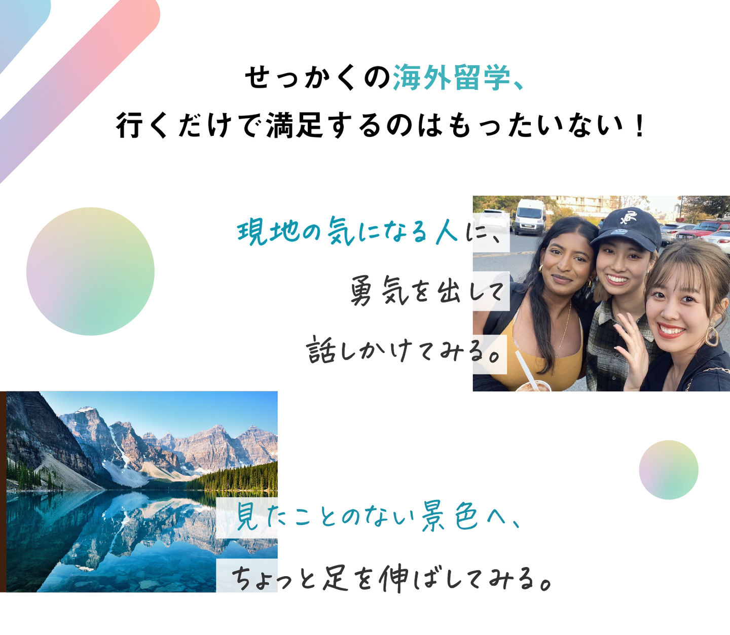 これまでのタグラインでは、コロナ禍でも挑戦することを諦めない人たちを支援し、一歩踏み出すことを恐れずに遣り続けようという想いを込め掲げましたが、留学するという行動面だけでなく、留学をした先にある「体験」の魅力をもっと多くの方に知っていただきたいと考え、新たなタグラインを掲げることとしました。
