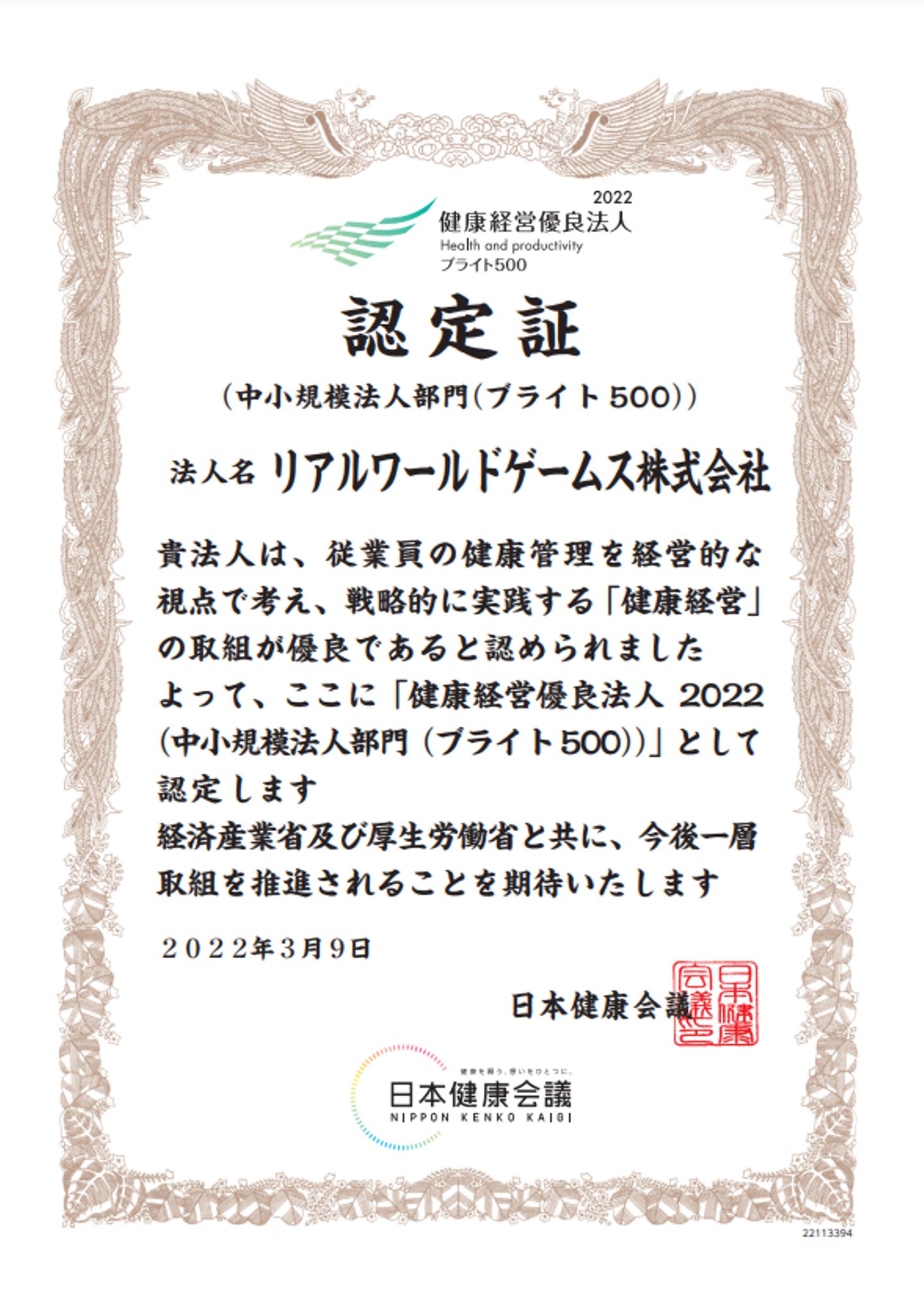 3月9日の経済産業省の発表で、RWGが健康経営優良法人2022に認定されました。