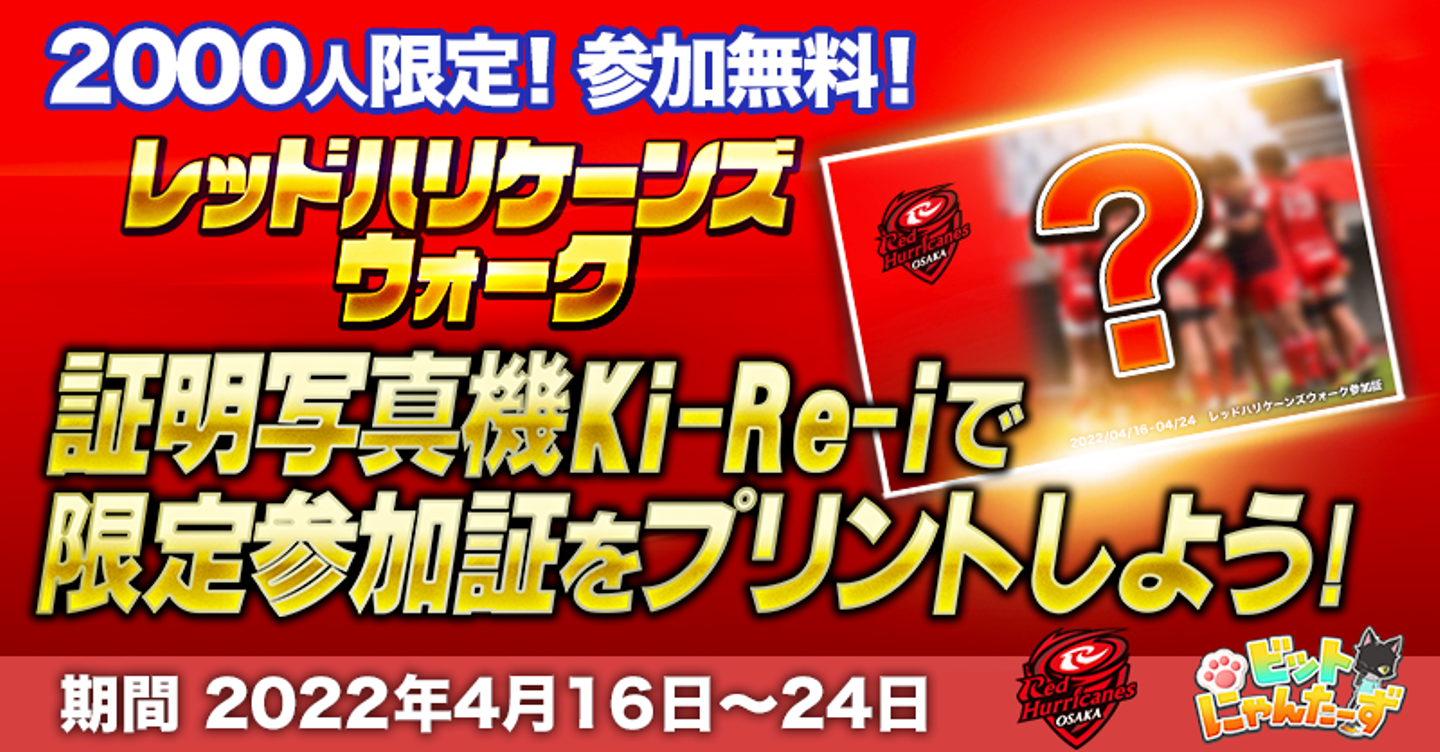 リアルワールドゲームス株式会社(本社:東京都千代田区、代表取締役:清古 貴史)は、2022年4月16日、NTTドコモレッドハリケーンズ大阪(拠点:大阪府大阪市、ゼネラルマネージャー:下沖 正博)並びに大日本印刷株式会社(本社:東京都新宿区、代表取締役社長:北島 義斉)と協業し大日本印刷の保有する証明写真機「Ki-Re-i」を用いたイベントを開催します。