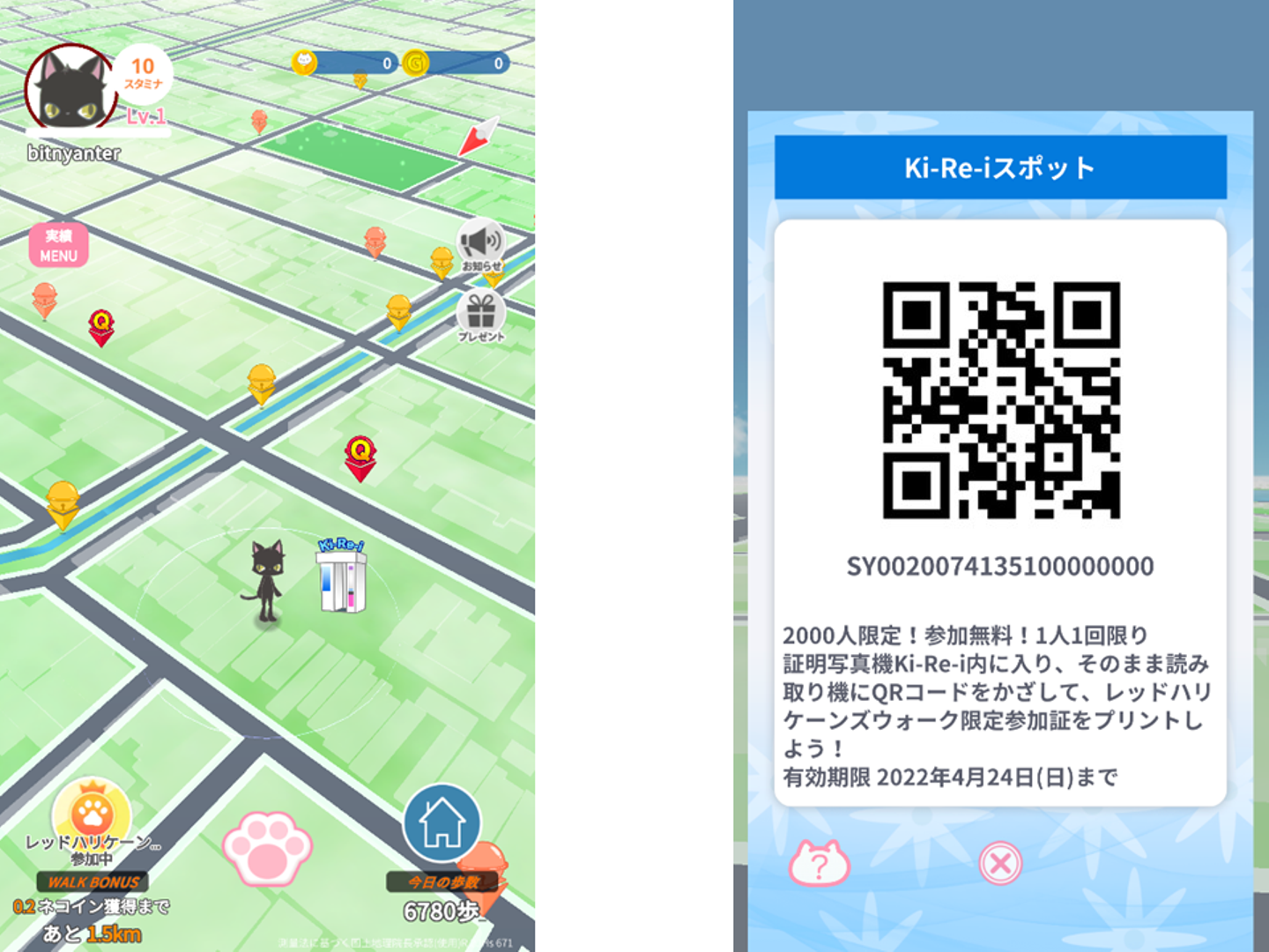 ビトにゃんでアプリ内イベントの「レッドハリケーンズウォーク」に参加すると、証明写真機「Ki-Re-i」がスポットとして表示されます。