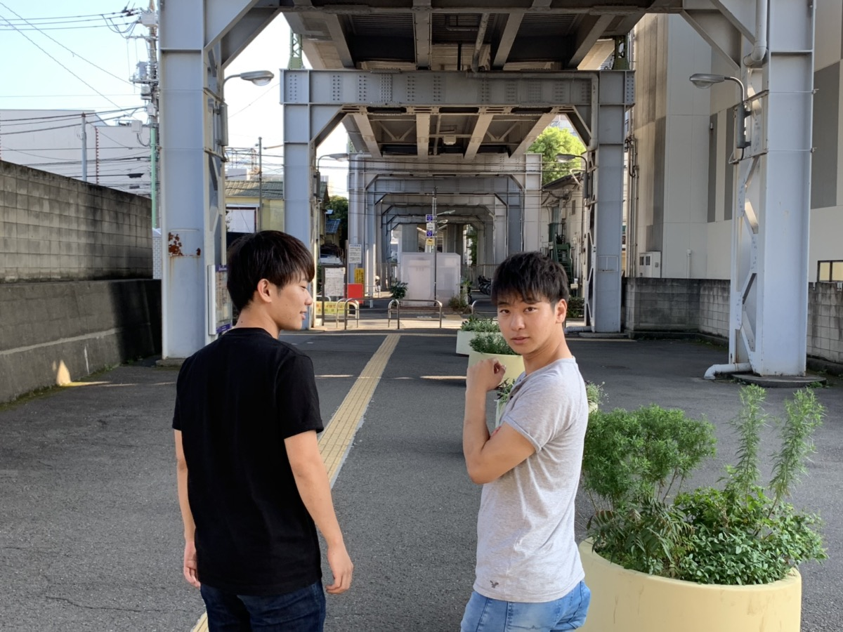 僕ら2人が立っているのが新馬場駅南口です。