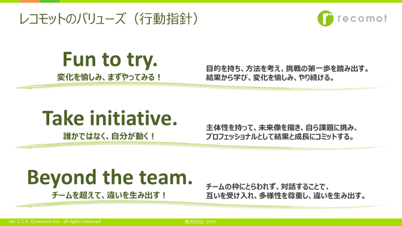 ここからは、受賞理由となった取り組みについて、3つのレコモットValuesに沿って1つずつ教えて下さい。
