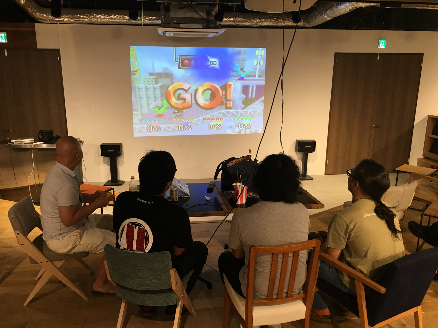 その後、懐かしのスマブラやマリカーを大型スクリーンに映して実行!