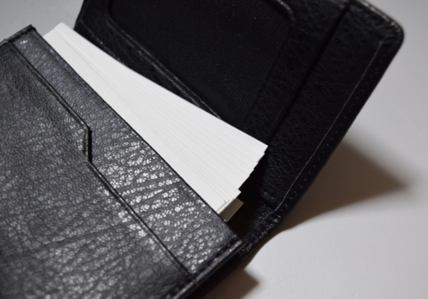 目につきやすい小物のひとつでもあるので、黒または茶色の革製の名刺入れがおすすめです。