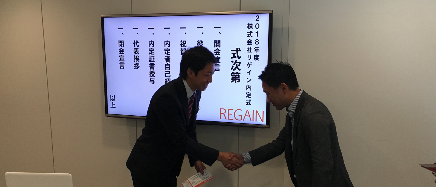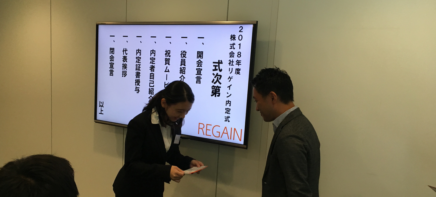 リゲインの内定式は役員と内定者のコミュニケーションの場でもあるので、冗談なども言える結構フランクな場なんです!
