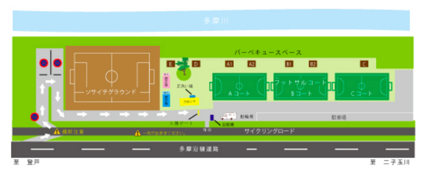 ソサイチ・フットサルコートなのですが、問い合わせてみたところ、その脇にある「BBQスペース」を運動場として貸していただけることになりました。(7区画のうち、2ヶ所を借りました。)