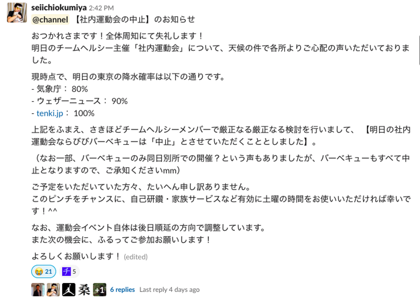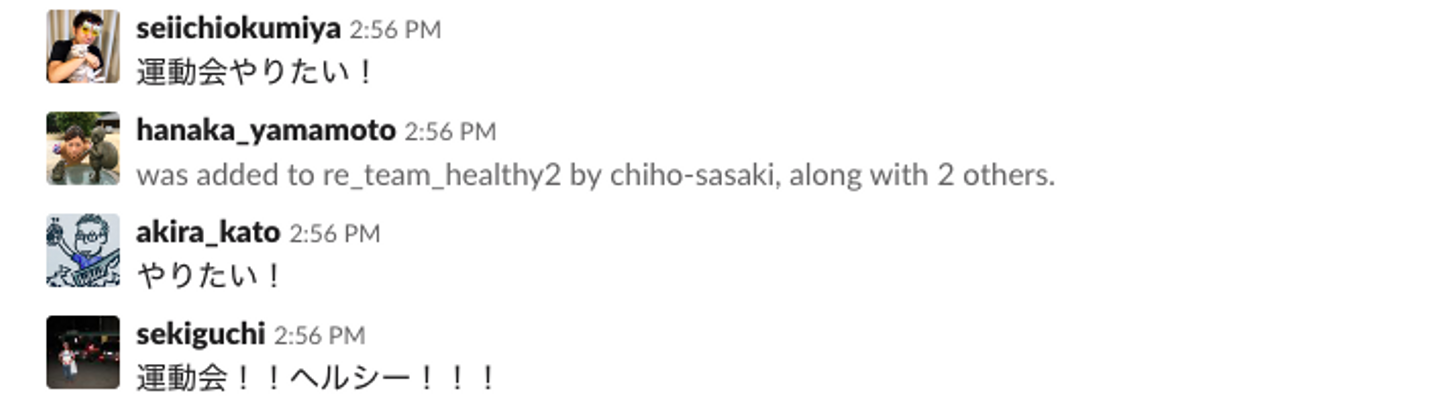 そのSlack専用チャネルでの記念すべき第一声が、「運動会やりたい!」でした(笑)。