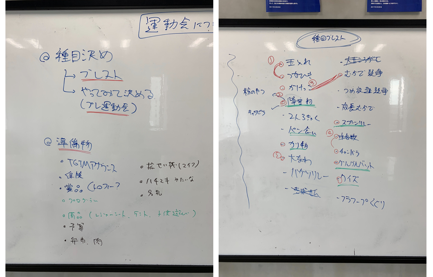 これに倣って、競技コンテンツのアイデア出し、プレ運動会での仮説検証、その結果をもとにした選定・準備を実施し、最高の運動会メニューを考えました。