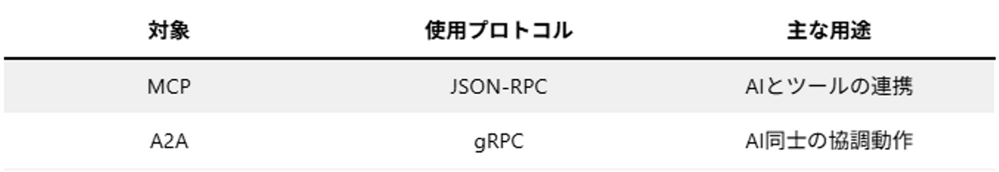 MCPは主に「AI ↔ ツール」を接続するのに対し、A2A(Agent-to-Agent)は「AI ↔ AI」を連携させるプロトコルです。
