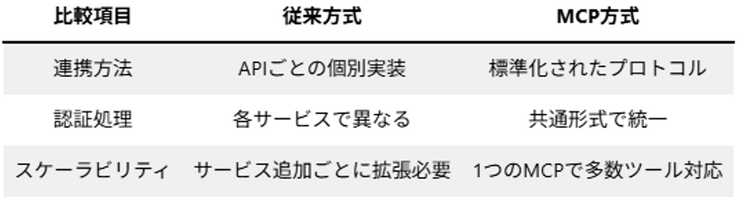 従来、AIと外部システムを連携させる場合は、各サービスのAPIを個別に実装する必要がありました。