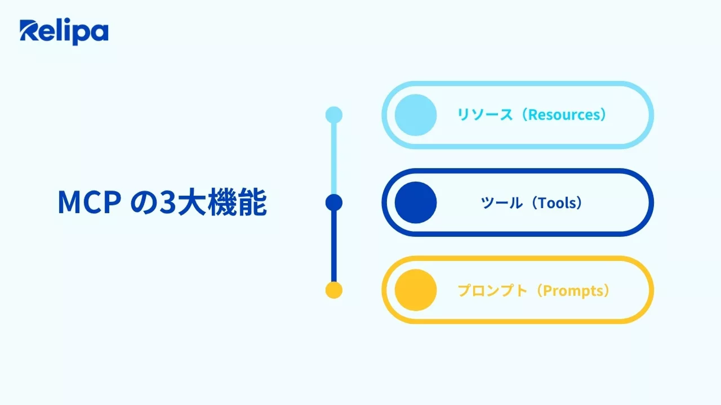 MCP(Model Context Protocol)の中心となるのが、リソース(Resources)、ツール(Tools)、そして プロンプト(Prompts) の3つの主要機能です。