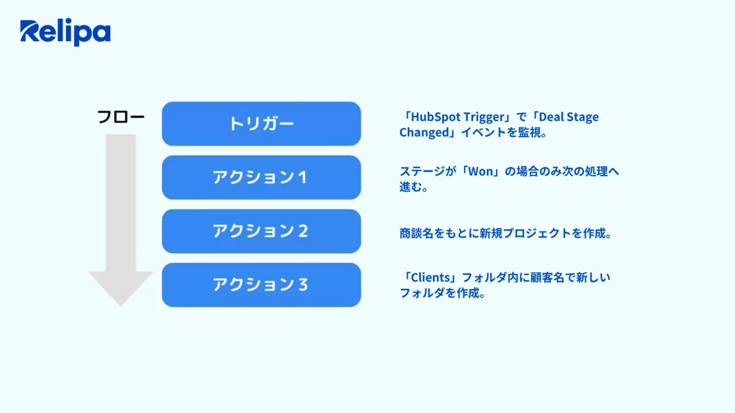 CRM(例:HubSpot)で商談ステージが「Won(成約)」に変わった際に、Asanaで新規プロジェクトとGoogle Driveフォルダを自動作成します。