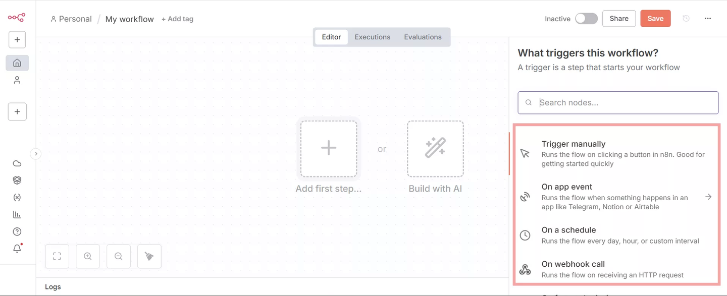 - 最初のノードは必ず「Trigger(トリガー)」として設定します。