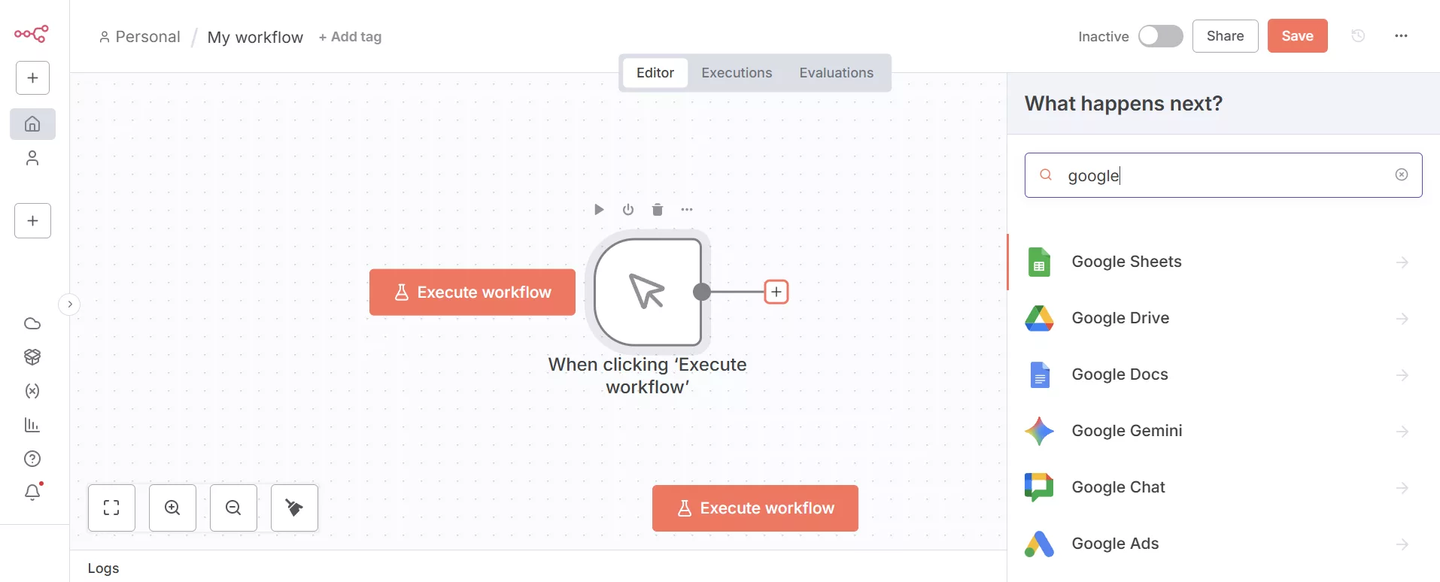 ここが、n8nでの自動化設計の中心となるビジュアルワークスペースです。
