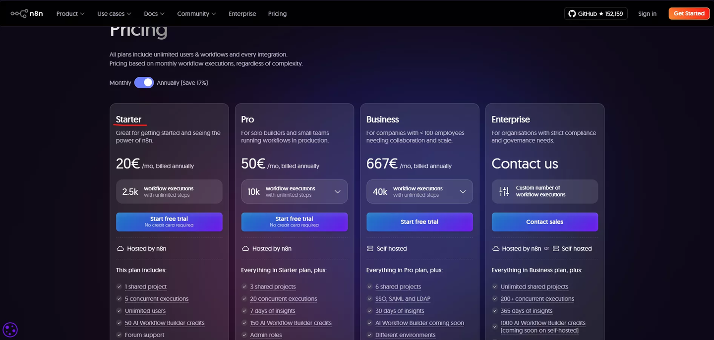 「Starterプラン」は月額約20ユーロで、一定数のExecutionsとActive Workflowsが含まれており、個人ユーザーや小規模企業に最適です。