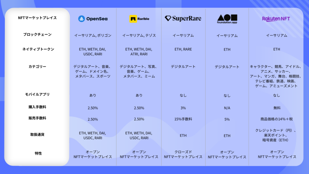 したがって、マーケットプレイスを選択する際には、検討すべきすべてのオプションと主要な要素を調査することが重要です。このような情報を一箇所で提供するために、最大の NFTマーケットプレイス を比較し、適切なマーケットプレイスを選択するために重要な主要な機能を理解できるようにしました。