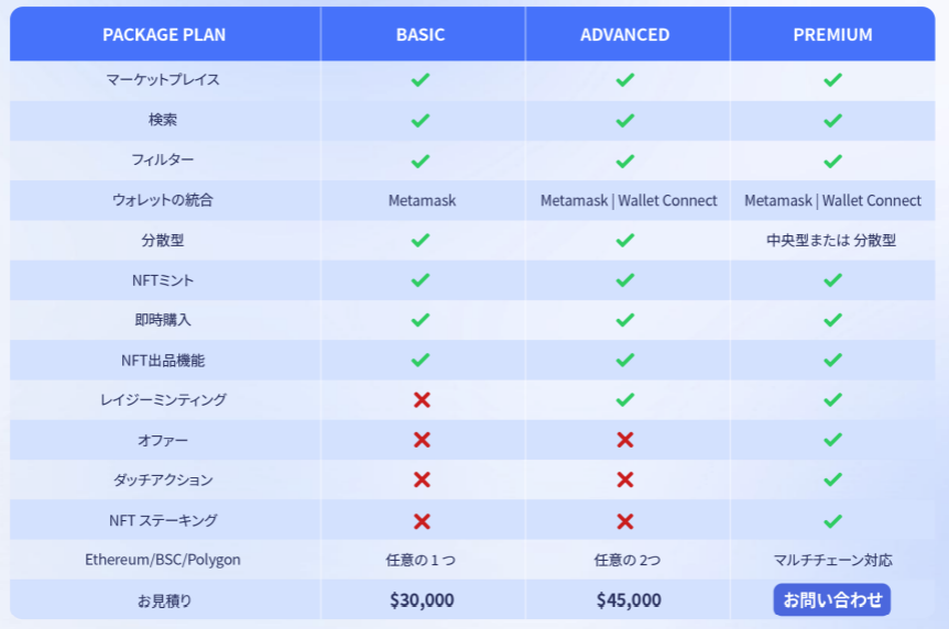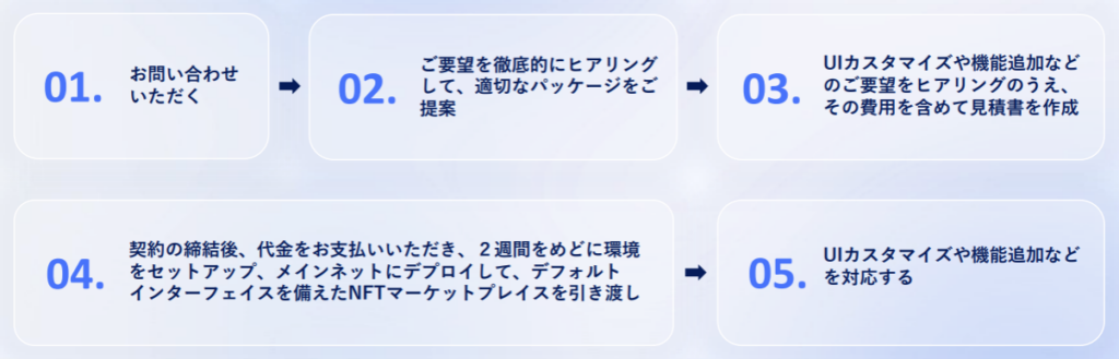 - 契約の締結後、代金をお支払いいただき、2週間を目安に環境をセットアップし、メインネットにデプロイして、デフォルトインターフェイスを備えたNFTマーケットプレイスを引き渡します。