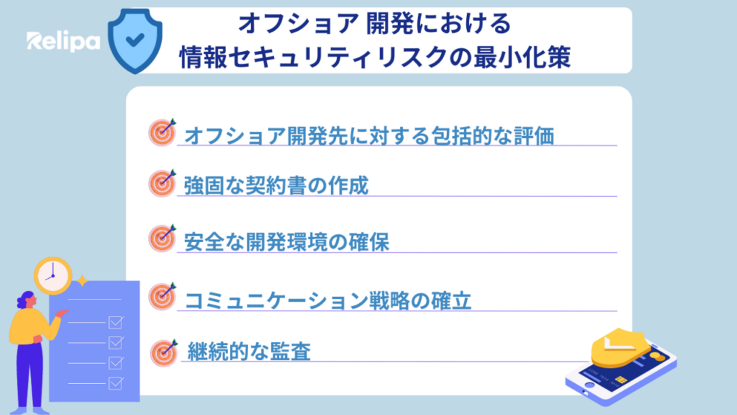 - オンサイト監査 (可能な場合):可能であれば、オフショア開発施設のオンサイト監査または検査を実施して、セキュリティインフラストラクチャを評価します。