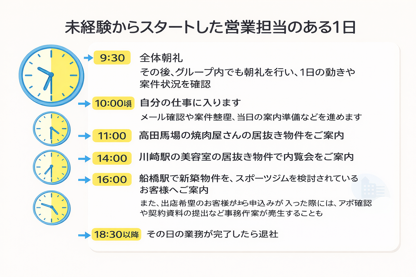 もちろん日によって忙しさは異なりますが、1日を終えたときには、案内した件数だけでなく、学んだことや気づいたこともしっかり積み上がっています。
