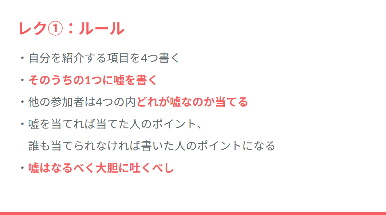 といってもルールはシンプルで、自己紹介にあえて嘘を1つだけ混ぜて、相手の嘘を当てた人が勝ちというものです。