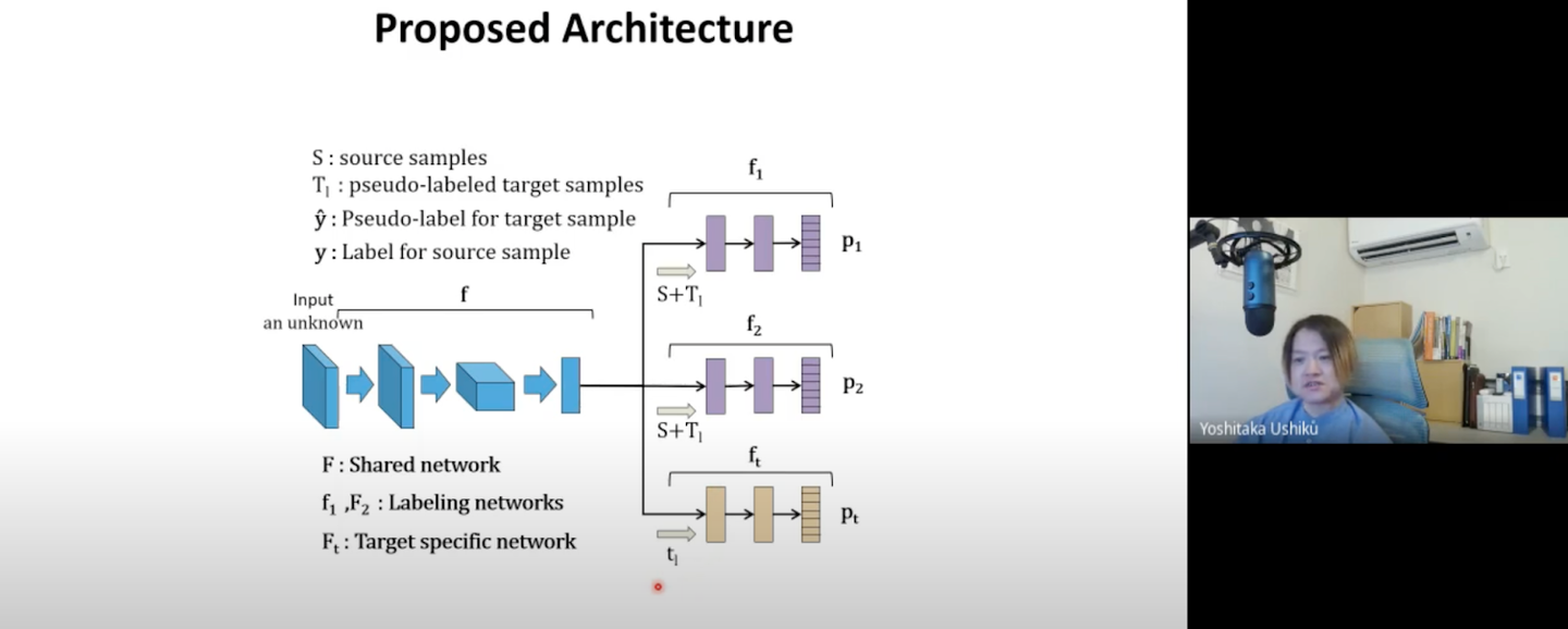 最初はSoruce Domainのデータのみで学習し、Target Domainのデータで推論させた際に紫の2つのネットワークの結果が近しく一定以上の確率であれば擬似ラベルを付与するといった流れでTarget Domainにラベルを付与していきます。