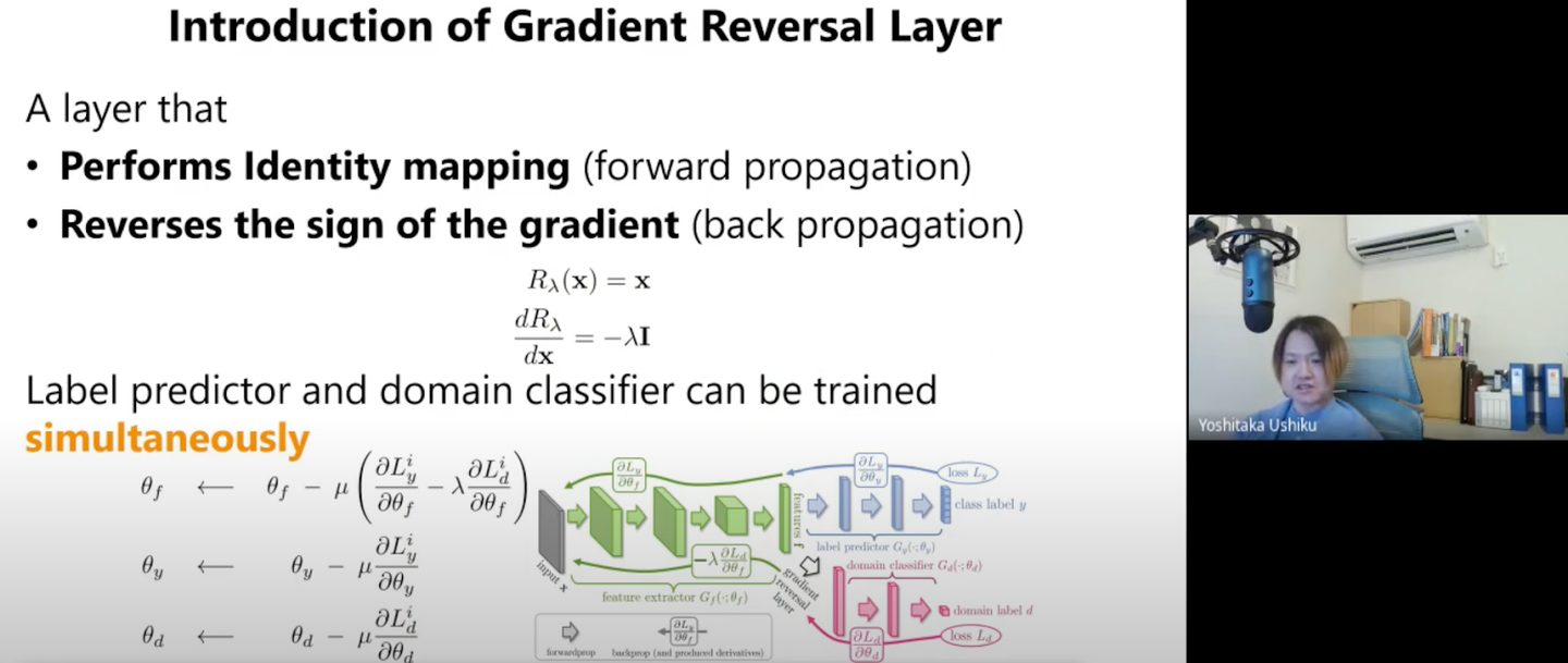 ここで登場するのが、順方向の時は何もせず、逆伝搬の時は勾配の符号を逆にする「Gradient Reversal Layer」です。これにより敵対的な学習を可能にしています。