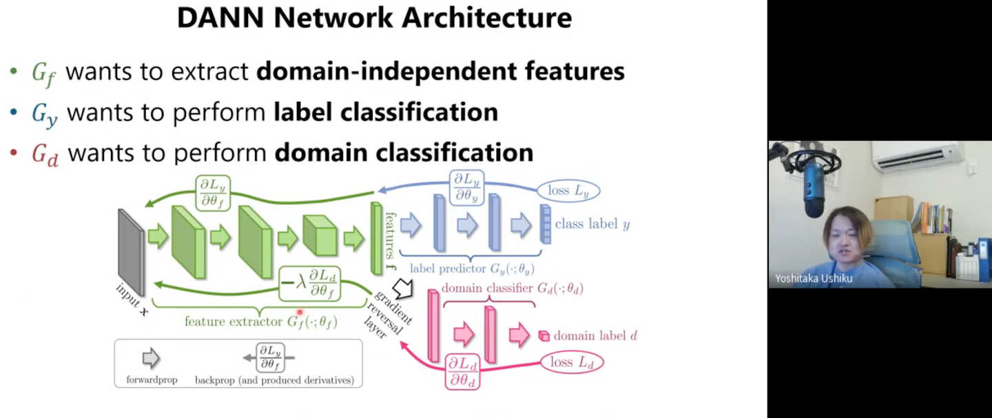 赤のモジュールはDomainの差を見破りたいため,Lossを最小化させたいですが、緑のモジュールはDomainによる差を無くしたいためLossを大きくしたいという目的を持っています。(GANとの違いは同じネットワークの中で逆の目的を持ったモジュールが存在していること)