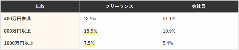 ですが、割合で見るとフリーランスの方が高収入を狙いやすいと言えそうですね。