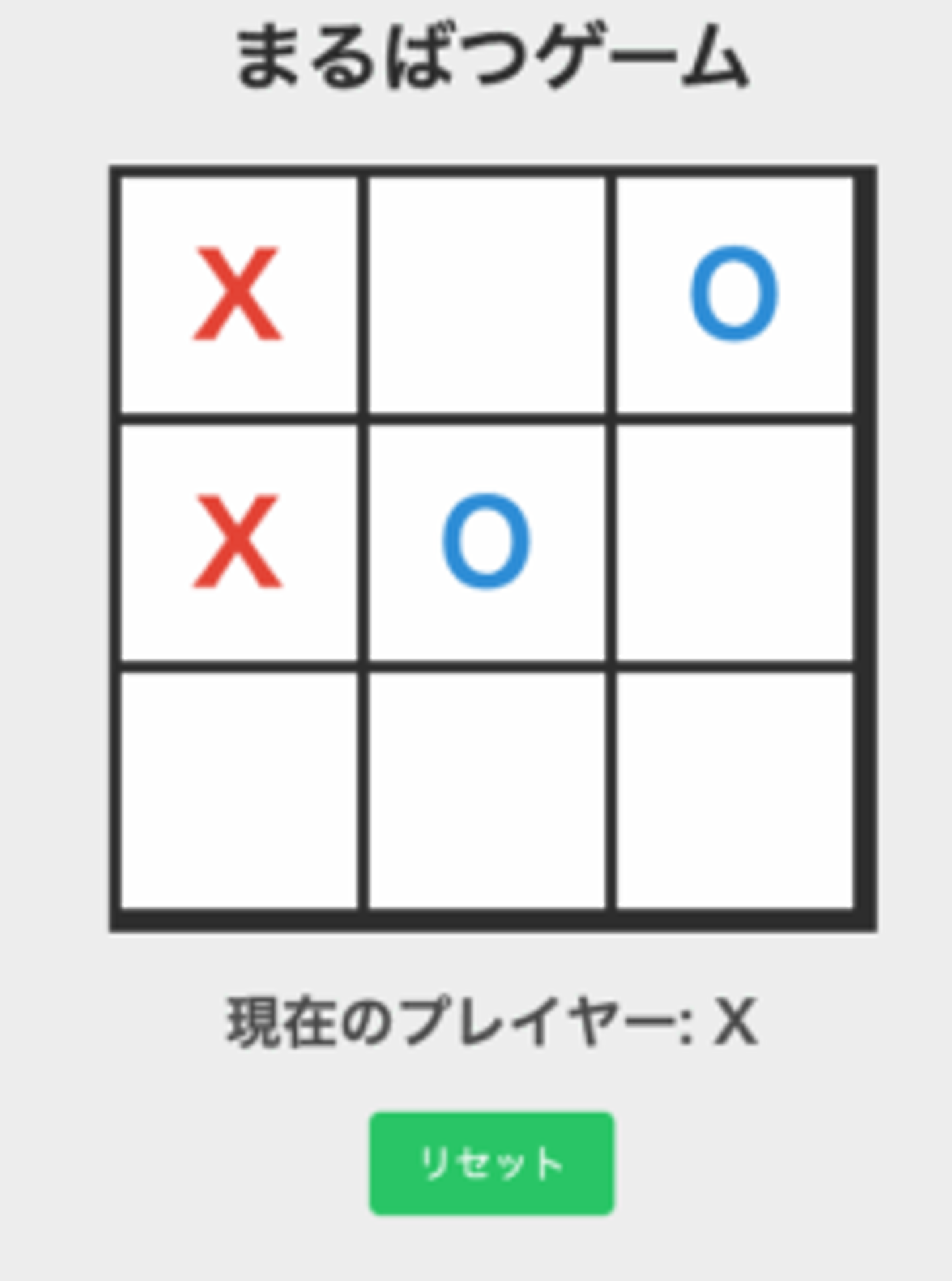- コードには、処理の内容が分かりやすくなるように適度にコメントを追加してください。上記のGEMINI.mdを用いて、生成したまるばつゲームは以下のようなものになりました。