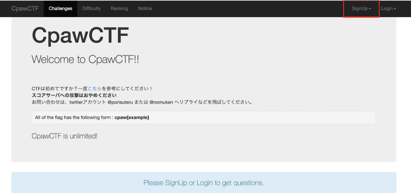 一口にCTFといっても種類があり、期間限定で開催されているものや常設のものと様々。今回は常設かつ難易度が比較的低いとされているCpawCTFに挑戦してみることにしました。
