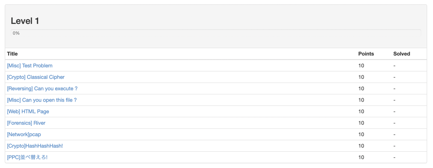 ユーザー登録あるいはログインが完了すると以下の画面が表示されます。CpawCTFは問題の難易度ごとにレベル分けされており、今回は最もかんたんなLevel1の問題を解いてみます。
