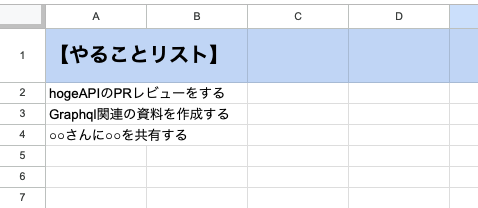 次にA列の1行目に「やることリスト」と書き、その下に次の日のタスクを記載していきます。