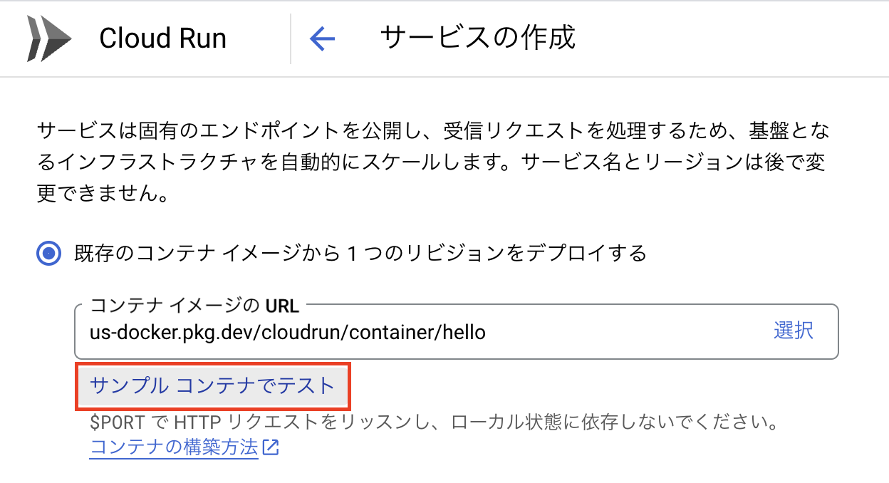 CloudRunにはお試し用のサンプルコンテナが用意されているので、今回はこちらを利用します。