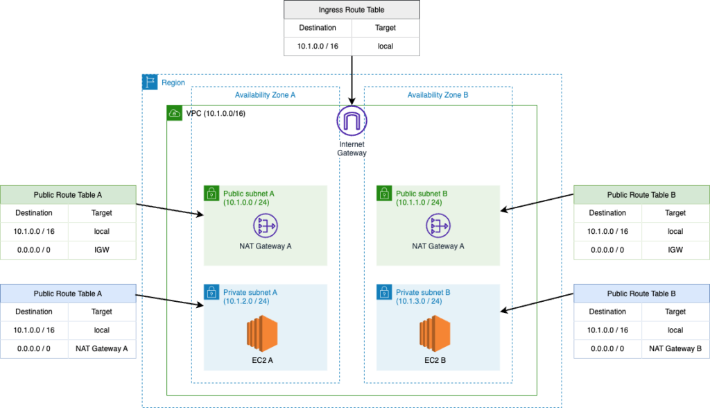 通常のInternet Gateway 経由で利用する際の基本構成(Multi-AZ 構成)はこんな感じですよね。