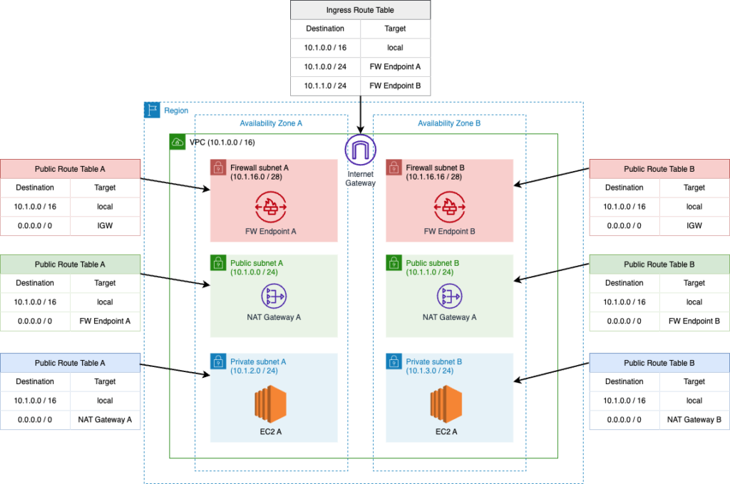 Network Firewallを設置する場合は、下記のようにルーティングする必要があります。