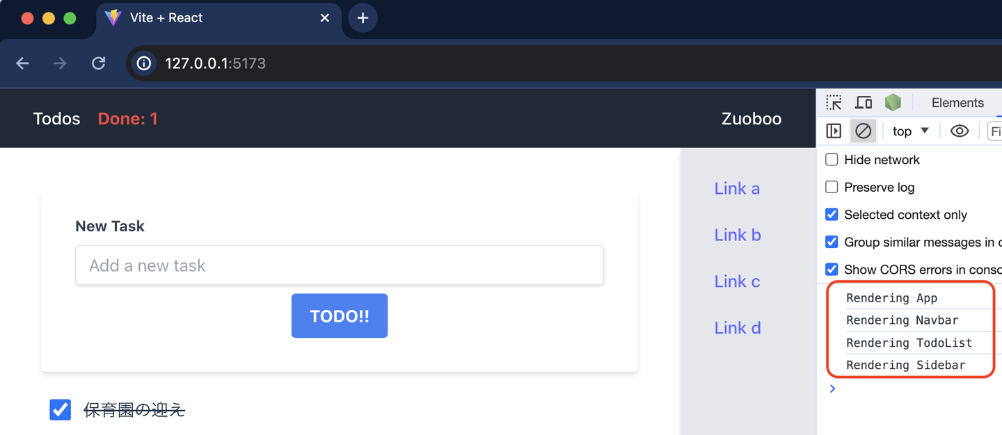 }では、TODOリストにチェックを入れた場合、どのコンポーネントがレンダリングされているのかを確認します。