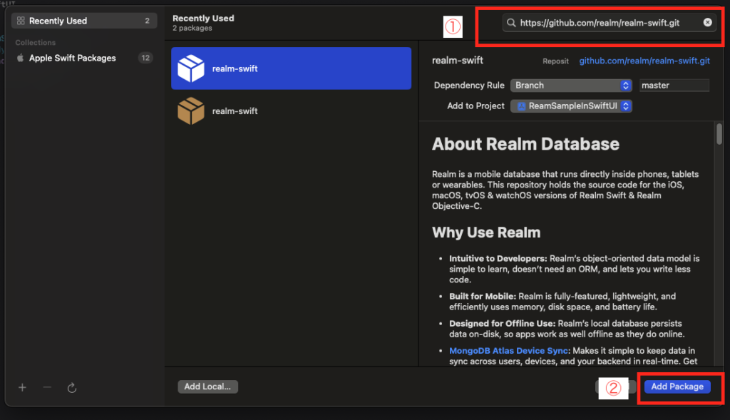 https://github.com/realm/realm-swift.git - ①の部分に上記URLを挿入する。②でPackageを導入する