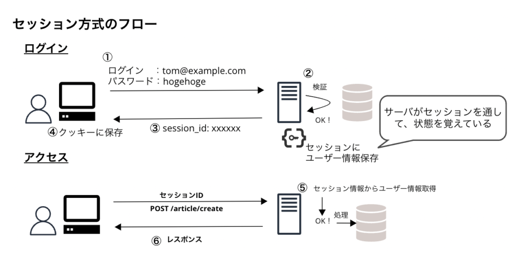 この方式だとサーバはセッションという形でユーザーの情報を保持していますが、上のトークン方式の場合、サーバーはトークンを払い出すだけでトークン自体の管理はしていません。