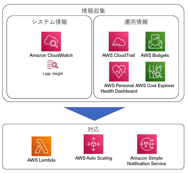 AWSの監視に便利なサービスを紹介します。ここでは大きくシステム情報と運用情報に分けています。